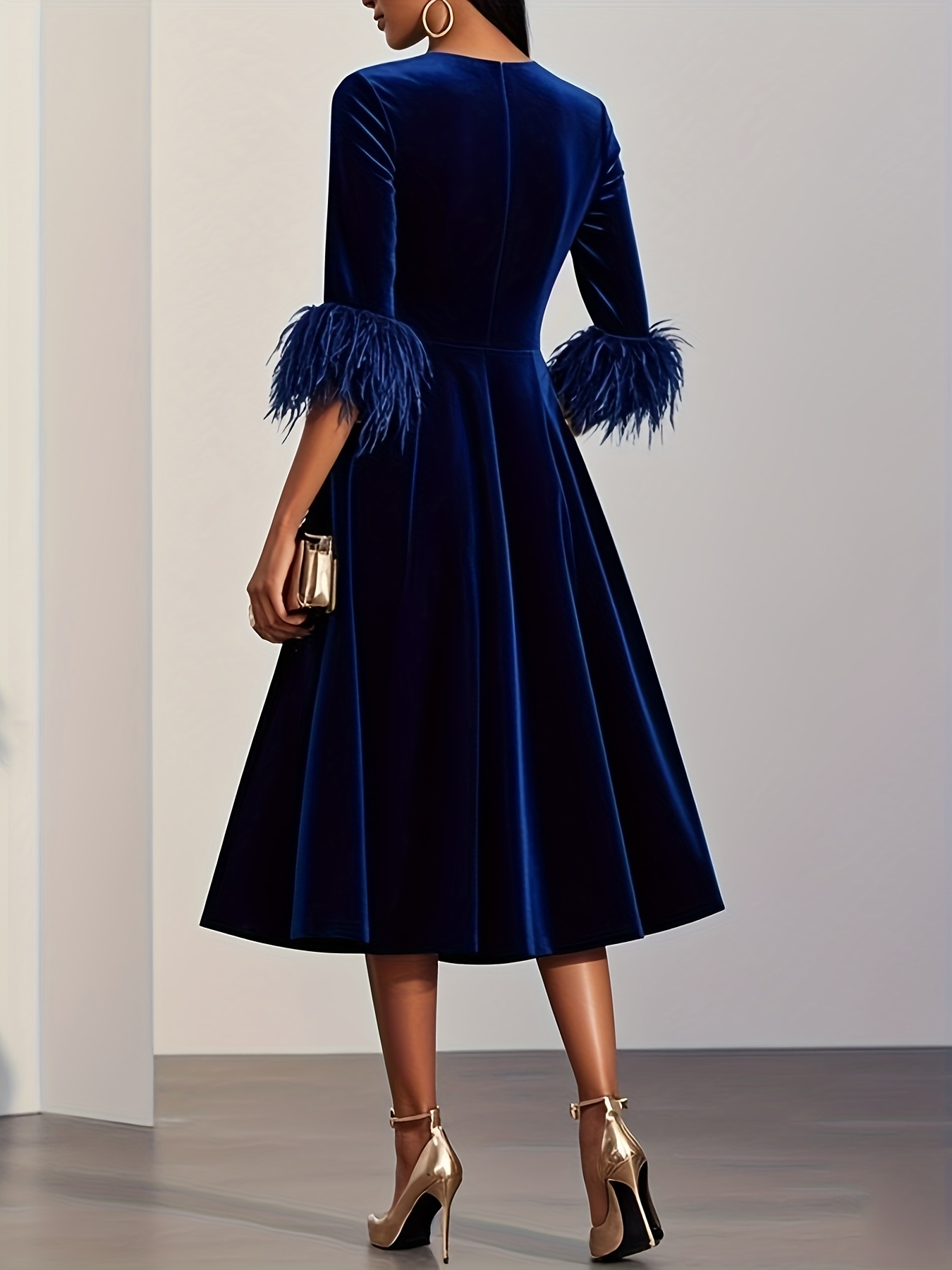Das Kleid, das ich bekommen habe sieht dem vom Bild nicht ähnlich. Es ist kein Samt sondern ein schlapper, dünner Niki-Stoff, sehr schlecht ausgeführt, die Länge ist von außen mit einem Doppelstepp abgenäht, die Federn sind schmäler und fast schwarz.